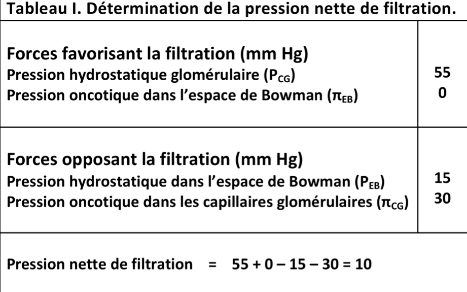 * Pressions oncotiques (pression osmotique des prots) de chaque côté du filtre glomérulaire soit celle dans capillaire glomérulaire (𝝅CG) et celle dans espace de Bowman (𝝅EB)