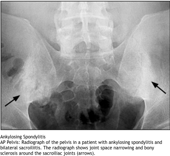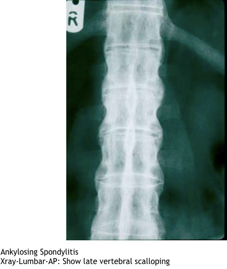 marginal syndesmophytes, bamboo spine, ossificiation of disc space, osteopenia, strong assoc wiht HLA b27, younger pts, bilateral sacroilitis