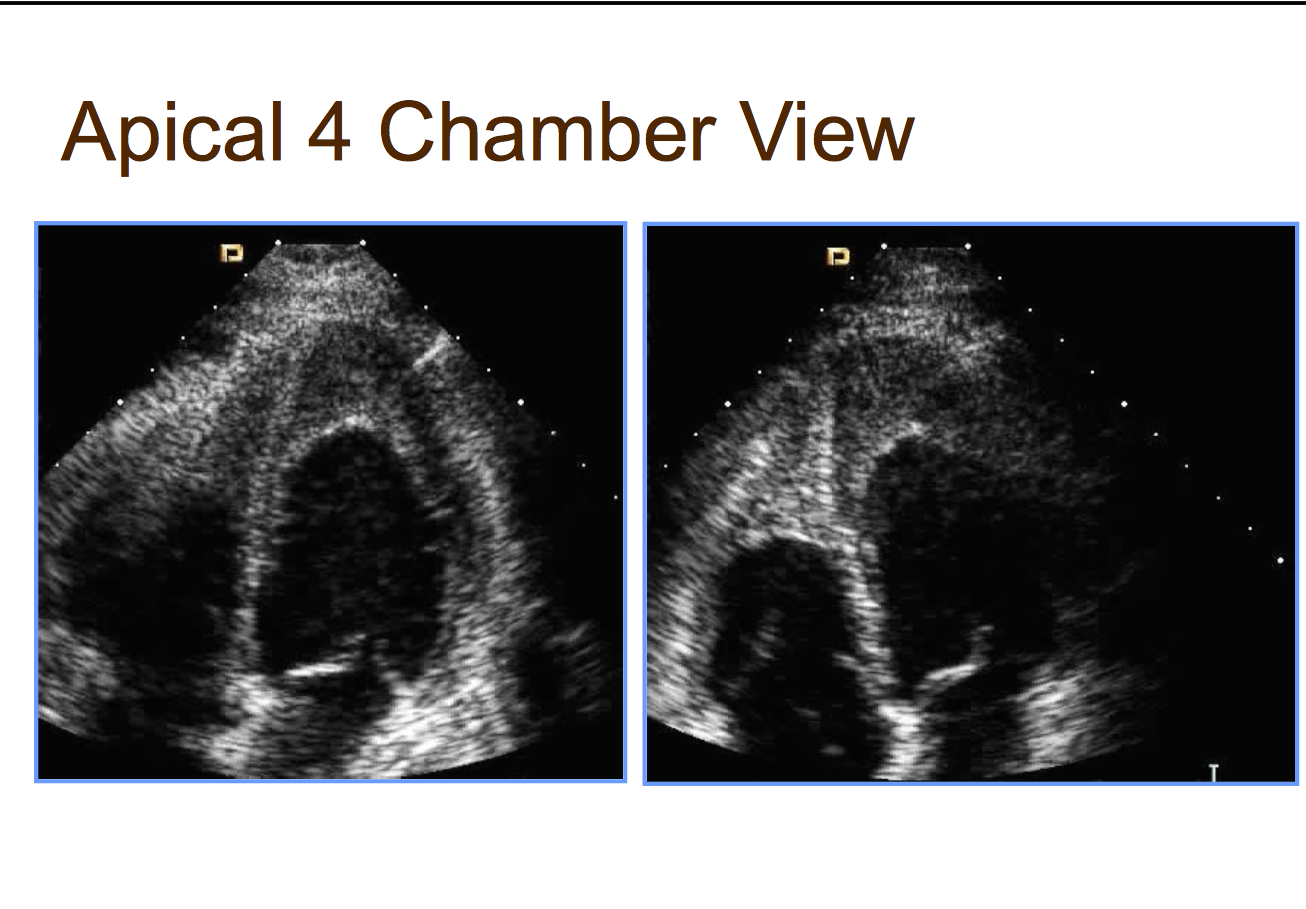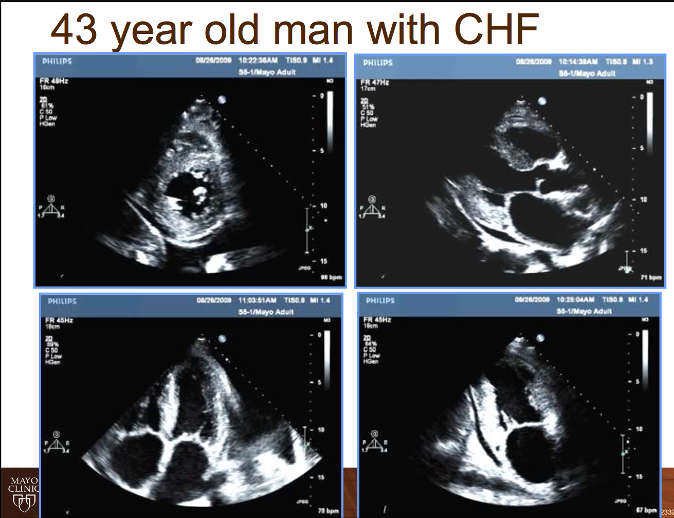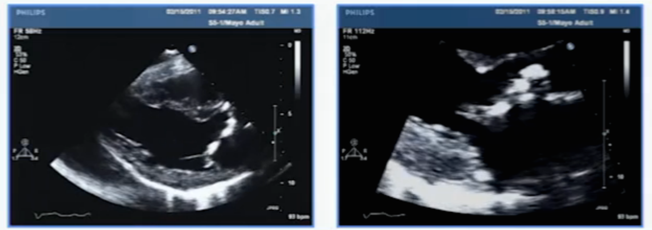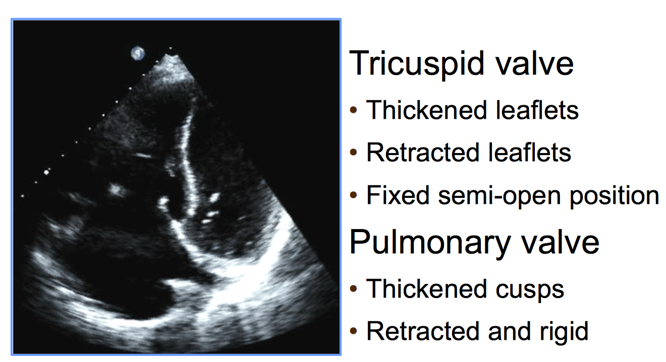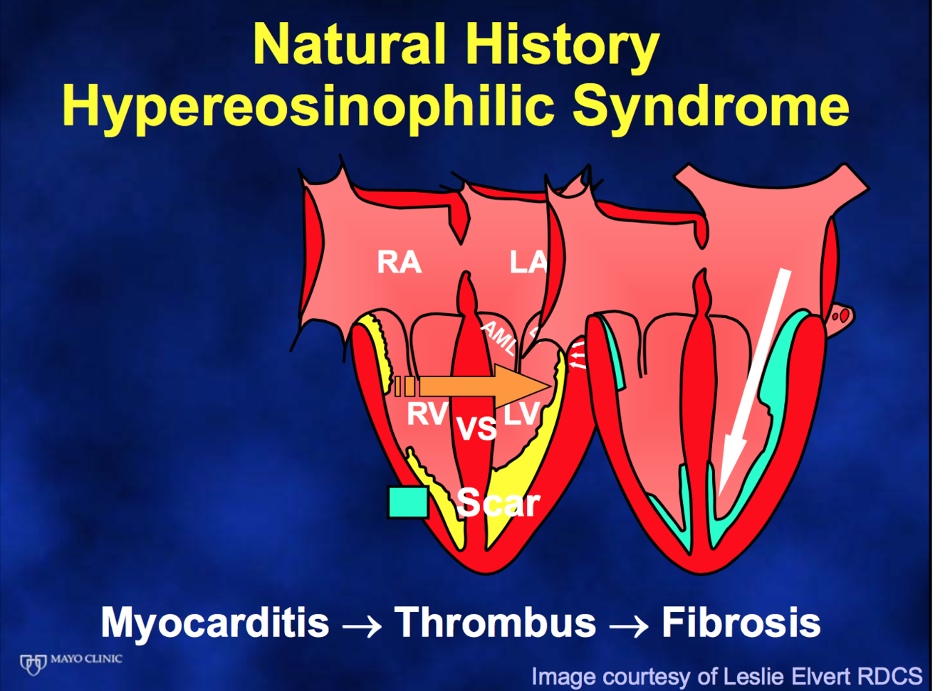 eosinophilic endomyocardial dz. contrast to look for LV apical thrombis. MV posterior leaflet covered with gook.