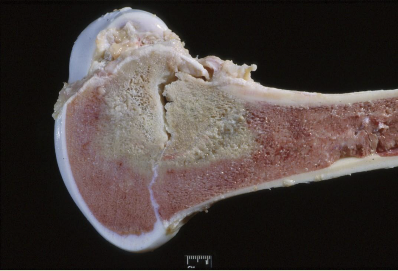 Focal/focally extensive area of pallor in the femur, near the growth plate/phytis