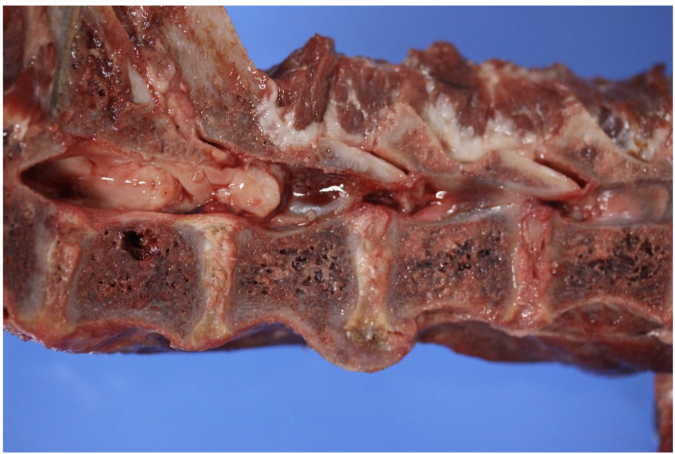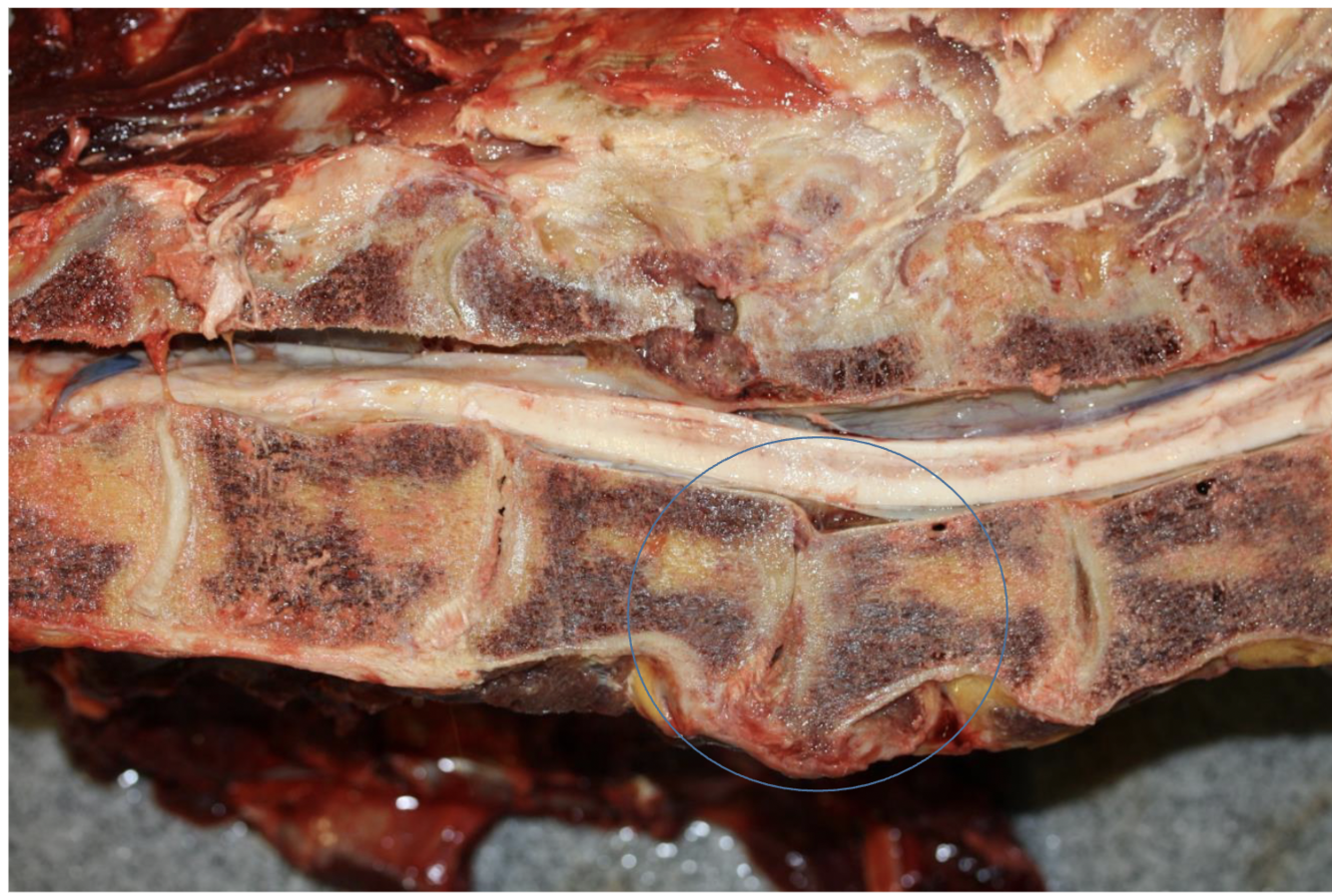 Inspicated (dried suppurative exudate). Destruction of vertebrae (circle around yellow).