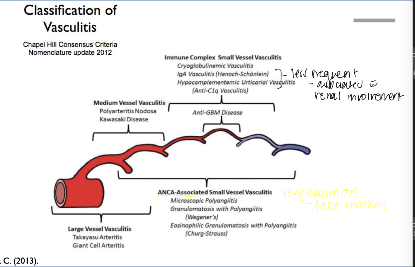 Small vessel (ANCA-Associated): microscopic polangitis, granulomatosis (wegeners), eosinophilic granulomatosis with polyangitis (MORE COMMON)