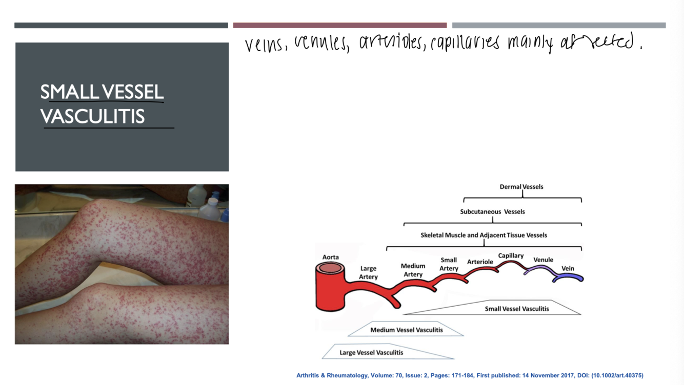 Small vessel (immune complex): cryglobulinemic vasculitis, igA vasculitis, hypocomplementemic urticarial vasulitis, (LESS FREQUENT)