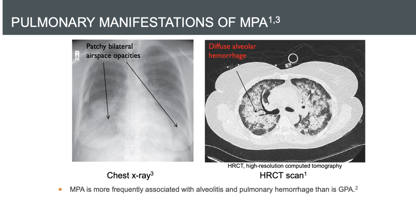 MPA: more frequently associated with alveolitis and pulmonary hemorrhage than GPA