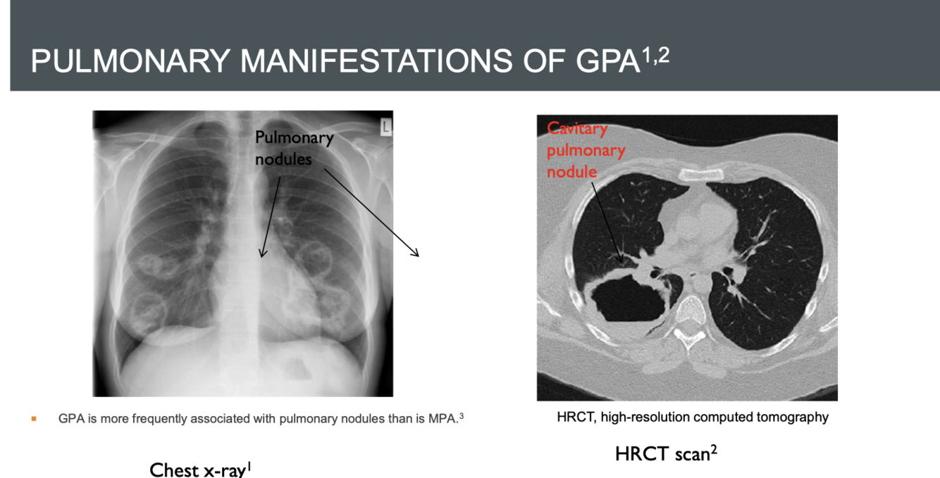 GPA. GPA is more frequently associated with pulmonary nodules than is MPA