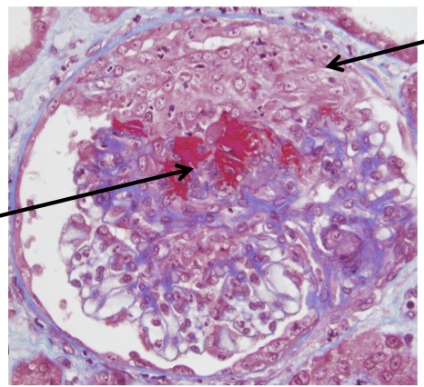in the acute phase, the glomerulonephritis is characterized by segmental fibrinoid necrosis and creascent formation