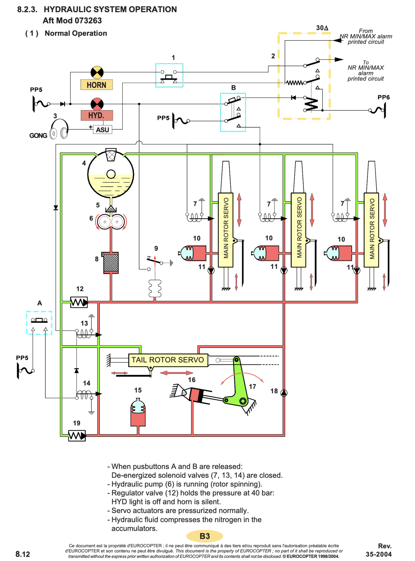 With the rotor spinning, shutting off the HYD switch opens solenoid valves (7) and (13). The pressure then drops, the “HYD” light illuminates and the control operating loads are instantaneously perceptible, except on the yaw pedals where they remain low due to the action of the compensator.