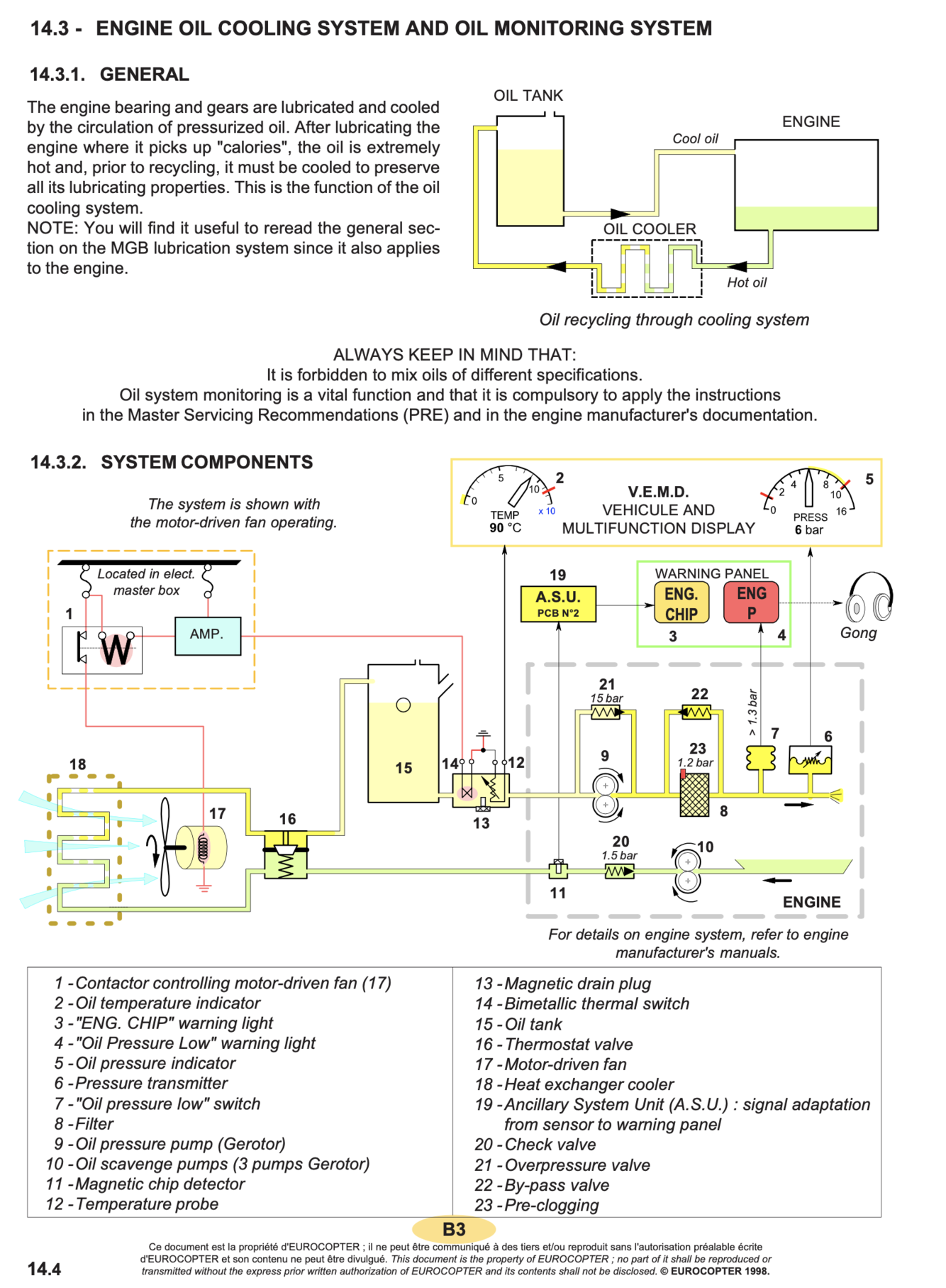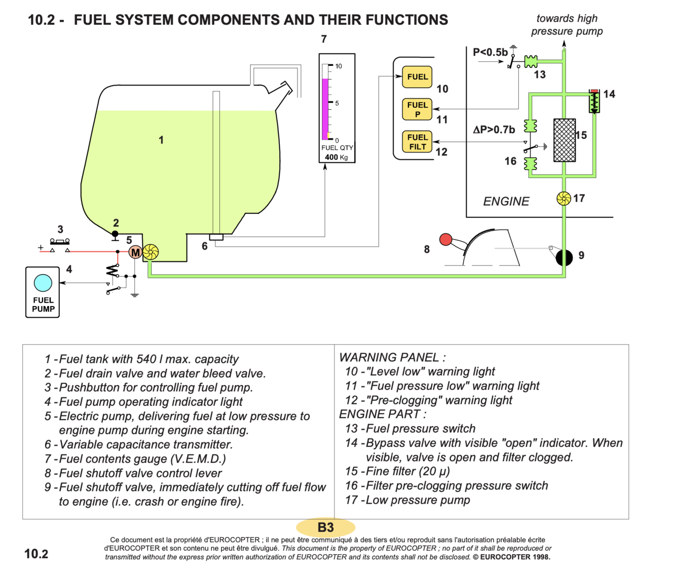 At power on, “FUEL P” warning light is illuminated. Pushbutton pressed, the blue warning light “FUEL PUMP” comes on, pump (5) is energized feeding the engine fuel circuit. “FUEL P” warning light goes out.