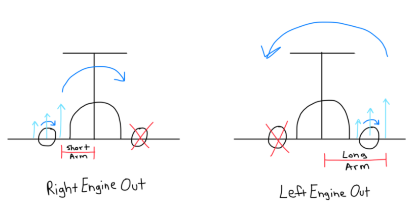 failure of the left engine will cause MORE loss of directional control, than the loss of the right engine b/c of the LONGER ARM of the right (operative) engines arm’s thrust causing a/c to yaw.