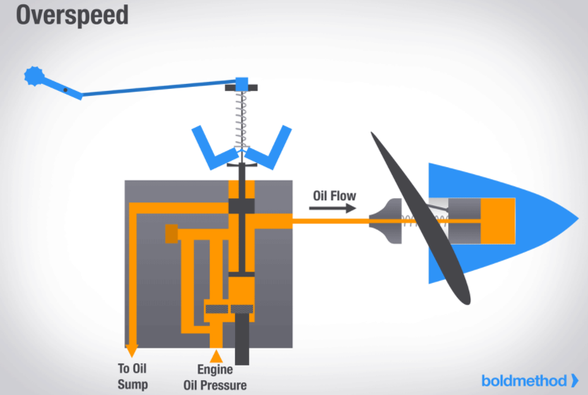 But you’re airplane is smart. As soon as this happens, the flyweights begin to wall inward b/c they slow down as well. When this happens, the pilot valve moves down and oil flows out of the propeller hub, reducing the pitch of the blades.