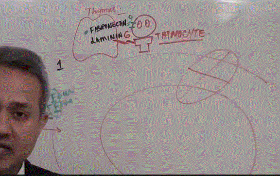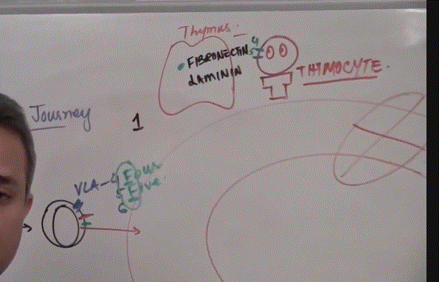 What is the purpose of VLA 4, 5 & 6 attaching to Fibronectin and Laminin in the thymus?