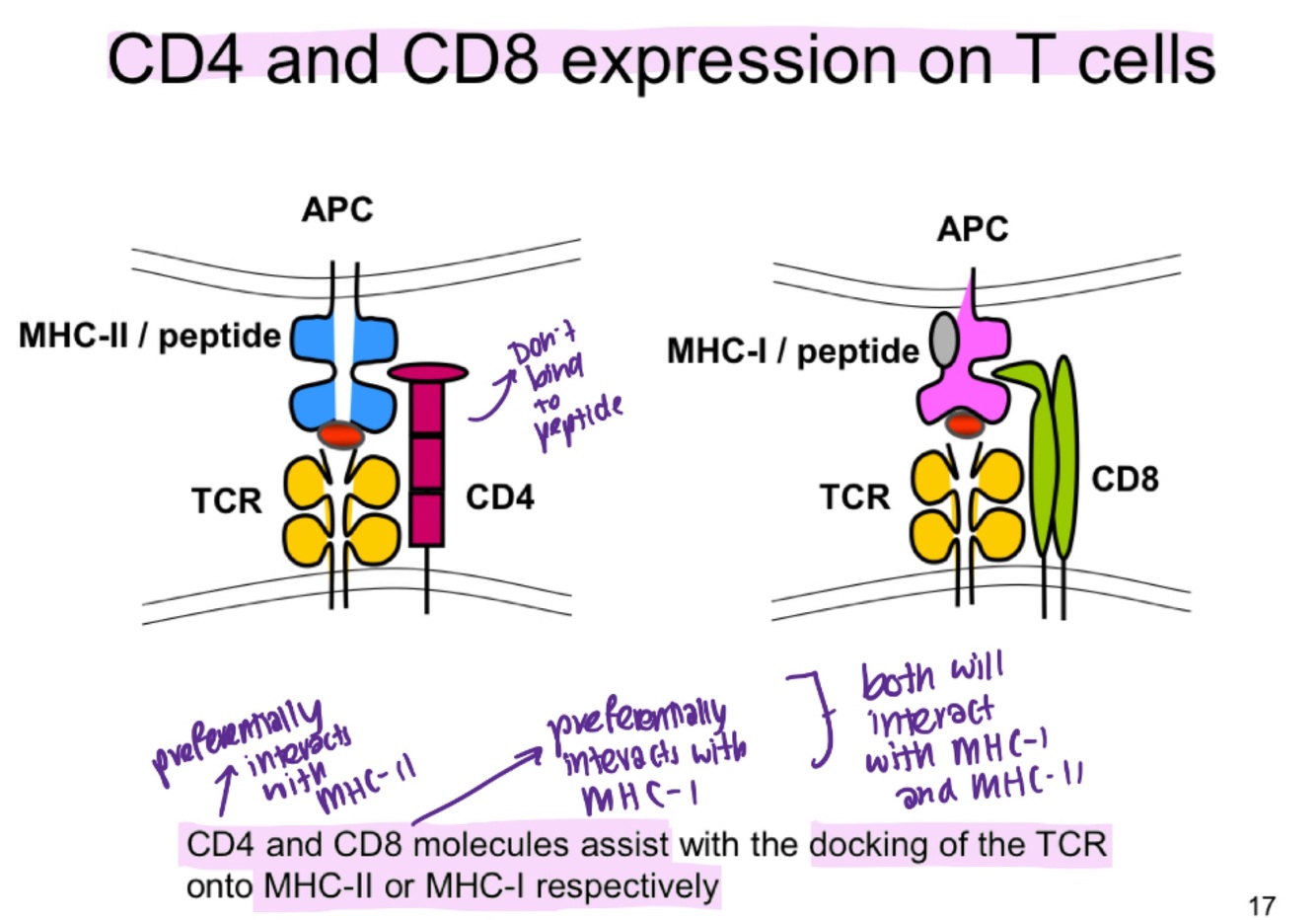 CD4 and CD8 molecules assist with the docking of TCR onto MHC-II or MHC-I respectively