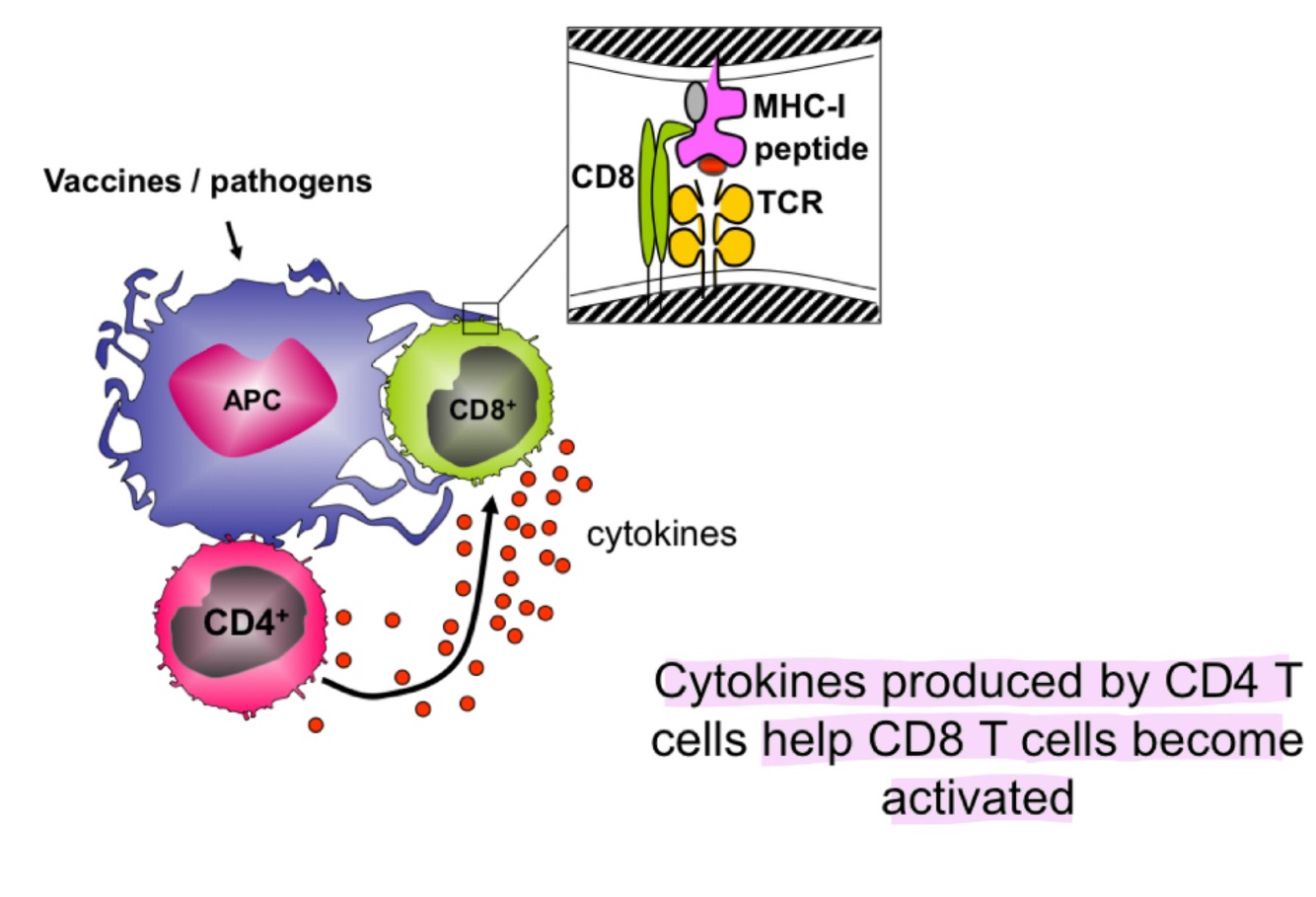 Cytokines produced by CD4 T cells help CD8 T cells become activated