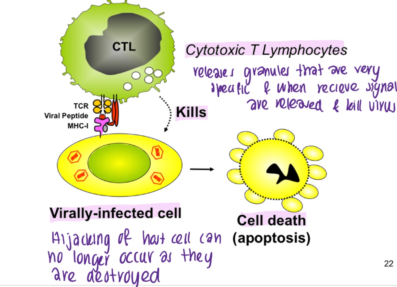 They release granules that are very specific and when recieved signals will be secreted and kill virus meaning the virus can no longer hijack host cell and the cell is destroyed