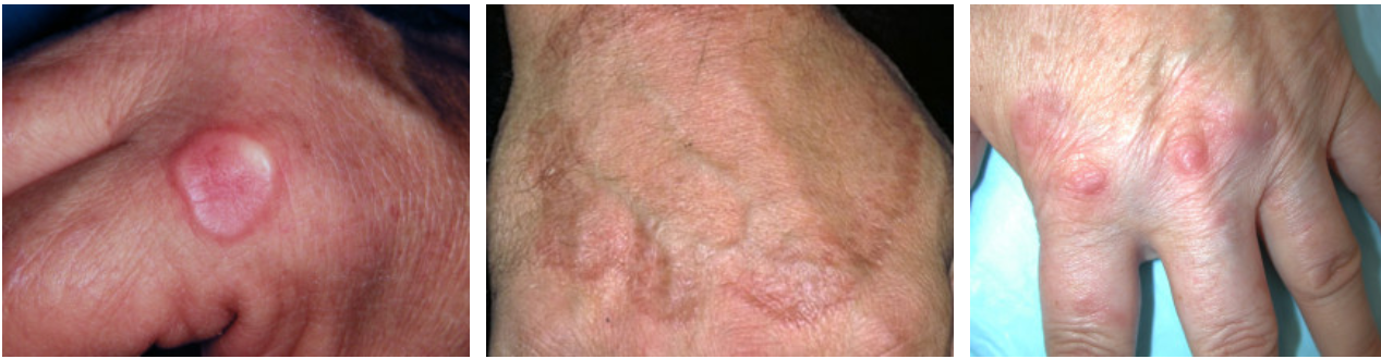 granuloma annulare (flesh-coloured papules coalescing in rings on the back of hands and fingers)