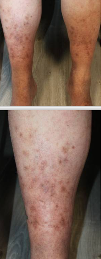 diabetic dermopathy (depressed pigmented scars on shins).
