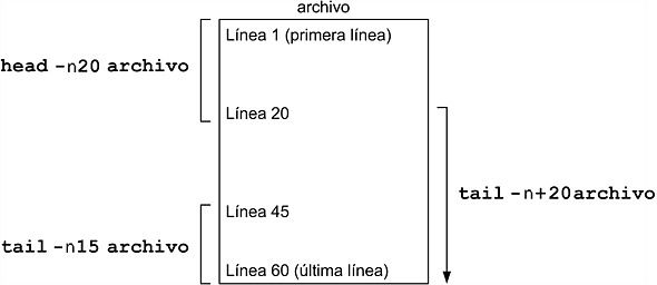 El comando head muestra de modo predeterminado las diez primeras líneas de un archivo. Se puede modificar esta opción a las N primeras líneas del archivo con la sintaxis head -nN.