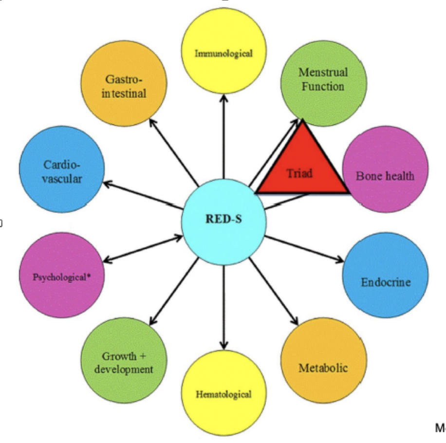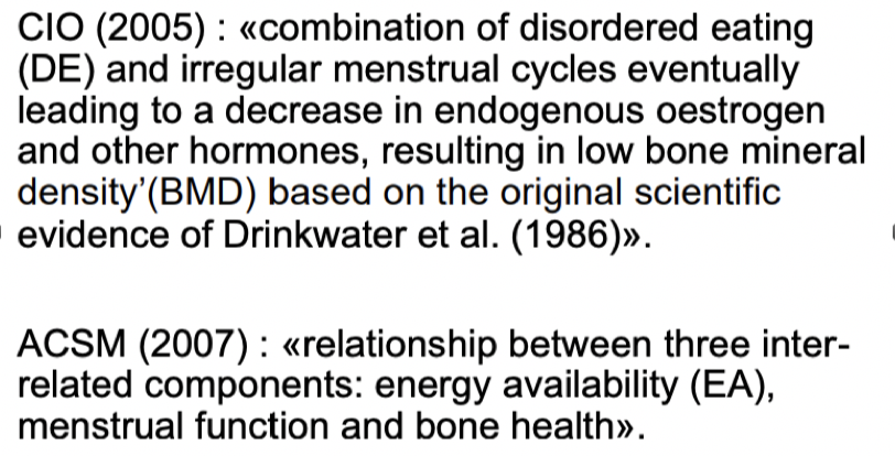 2014 : «Syndrome of RED-S refers to impaired physiological function including, but not limited to, metabolic rate, menstrual function, bone health, immunity, protein synthesis, cardioV health caused by relative energy deficiency.»