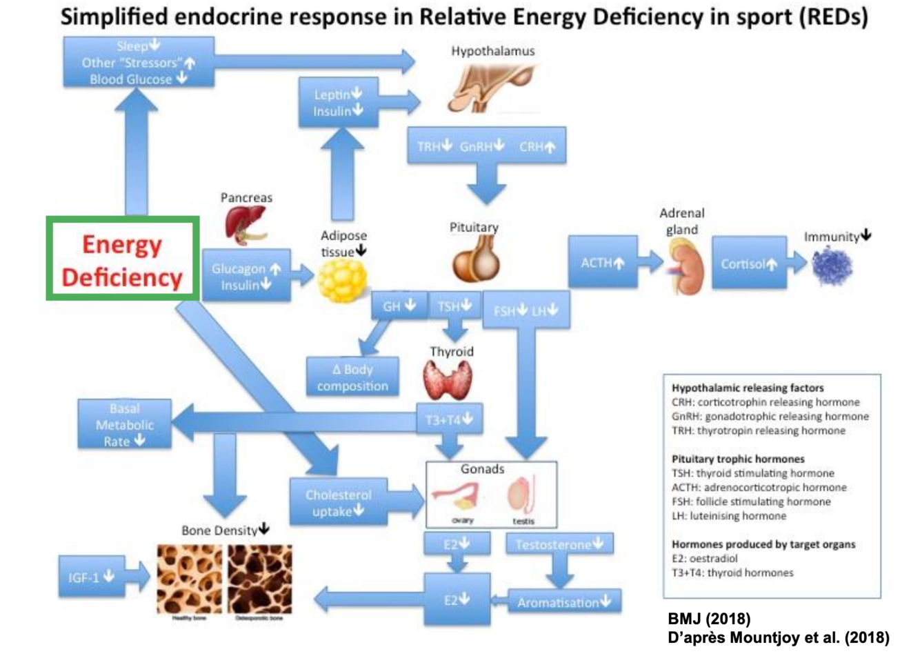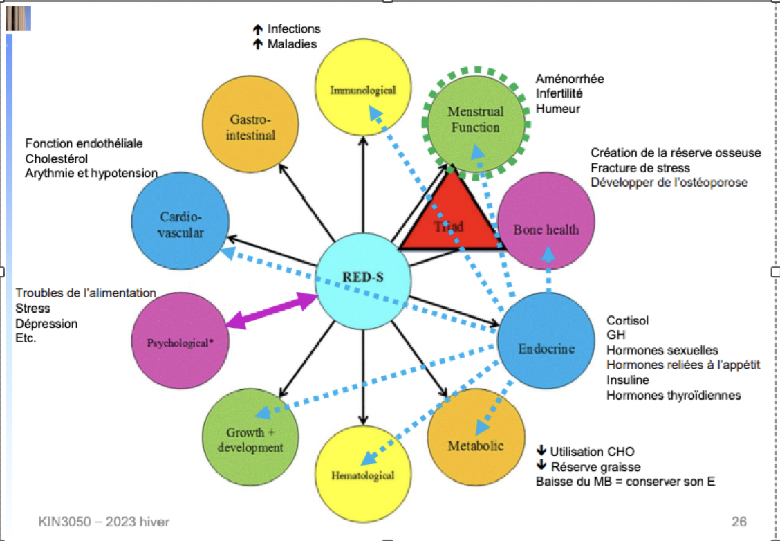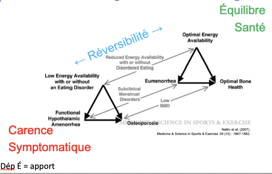 - Le déficit énergétique chronique vient affecter plusieurs structures. Les plus importantes sont au niveau des hormones sexuelles, la glande pituitaire et au niveau de la structure osseuse.