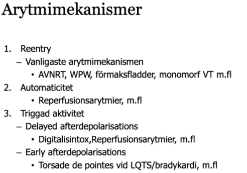 Beskriv dom 3 arrytmi-mekanismerna och vilka arrytmier som ingår i respektive kategori? (3p)