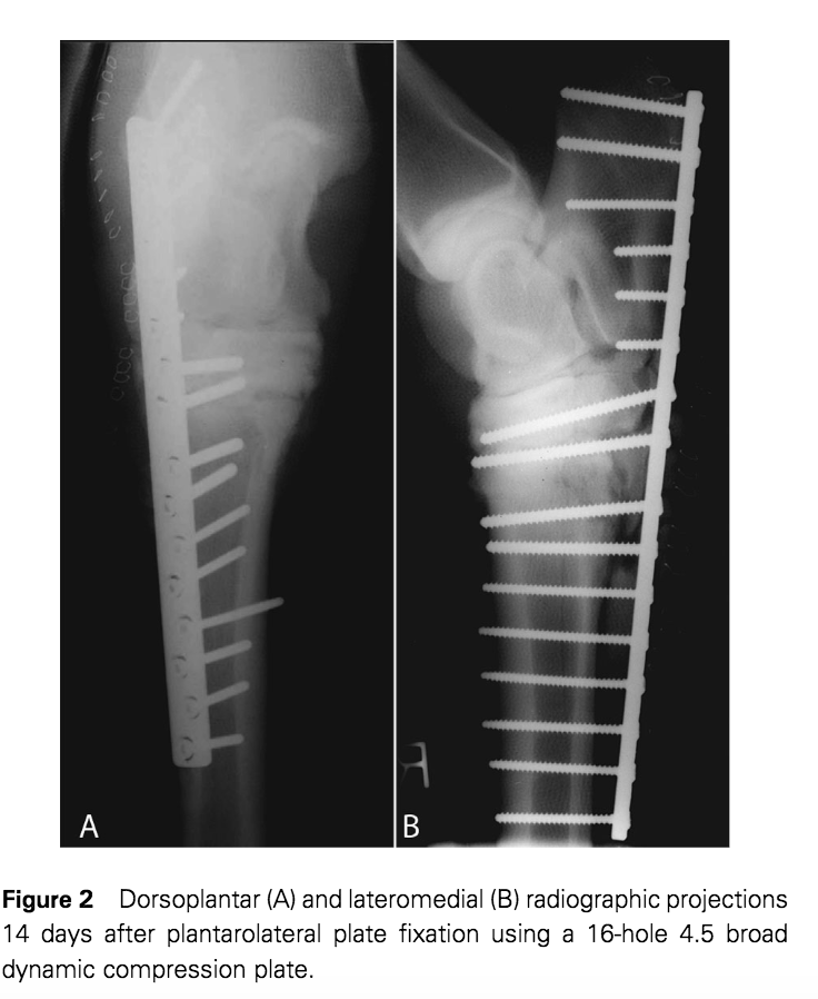 2) Open reduction and internal fixation/arthrodesis (cartilage removal (drilling) and LCP application) plus shorter period of external coaptation