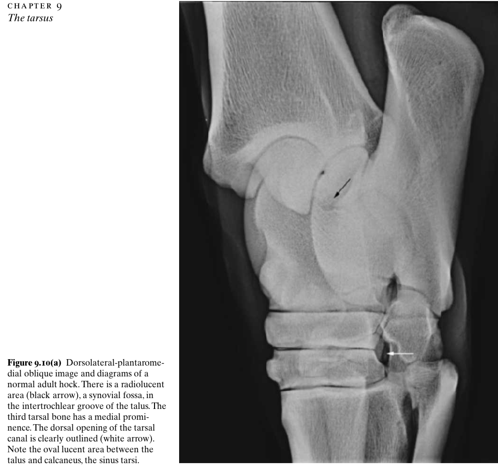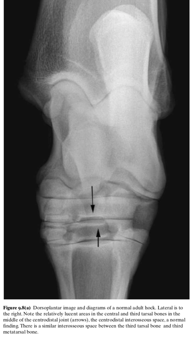 Mature tarsus: The dorsal margins of the central (TC) and third (T3) tarsal bones are slightly rounded, and the joint spaces between talus, TC, T3, and the fourth metatarsus are thin with parallel surfaces. The center of TC and T3 has a homogeneous trabecular density, and the articular surfaces have thin dense margins. The lateral trochlear ridge of the talus has formed a distal notch, and T1/2 are fused. The plantar calcaneal apophysis reaches the plantar calcaneal margin, and the distal calcaneal margin is flat