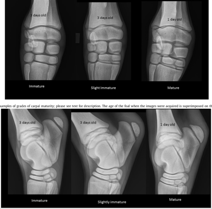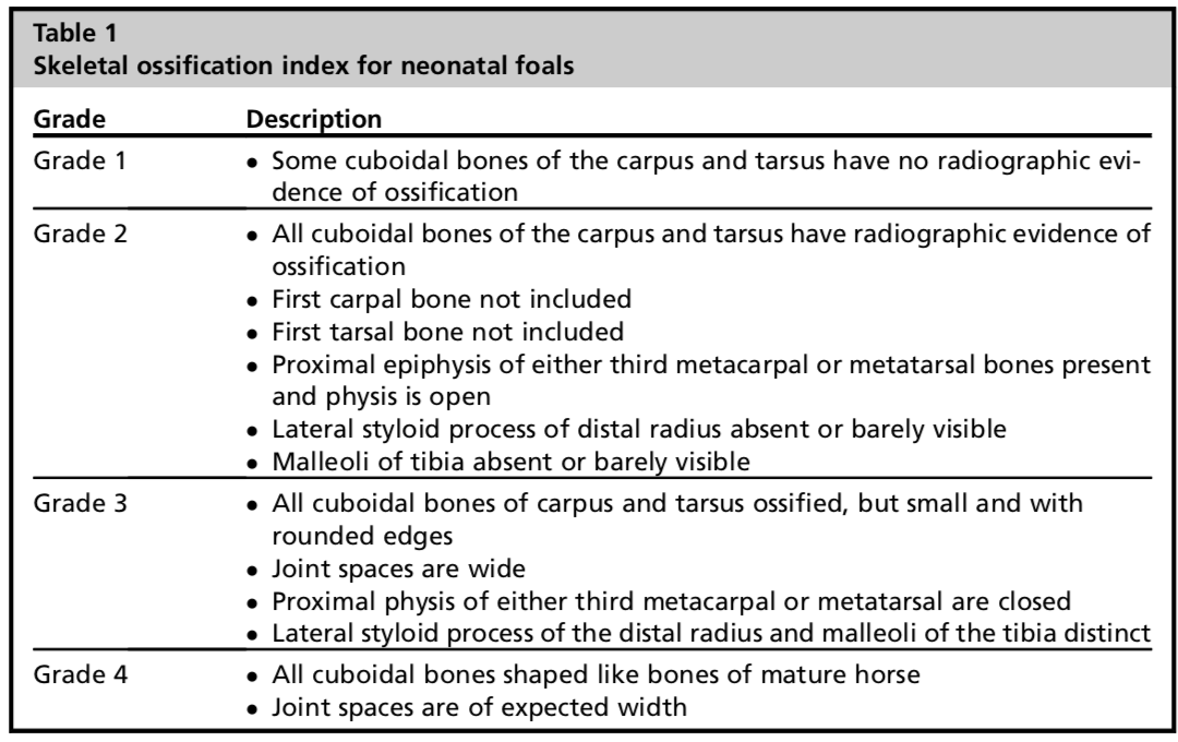The initial Adams Ossification index (1988) considers Grade 4 foals to be normal. Hayward 2018 showed that Grade 4 foals had normal gestation lengths and made it to the racetrack as frequently as their maternal siblings, BUT they did earn an average of $14,000 less than their maternal siblings.