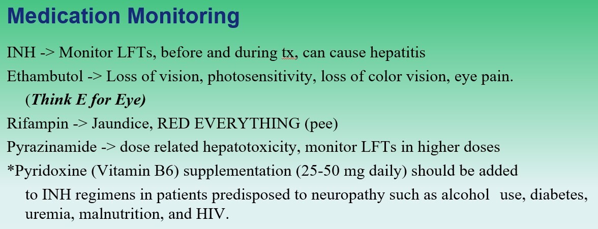 Isoniazid (INH): Hepatitis, neuropathy (take B6 to prevent neuropathy)