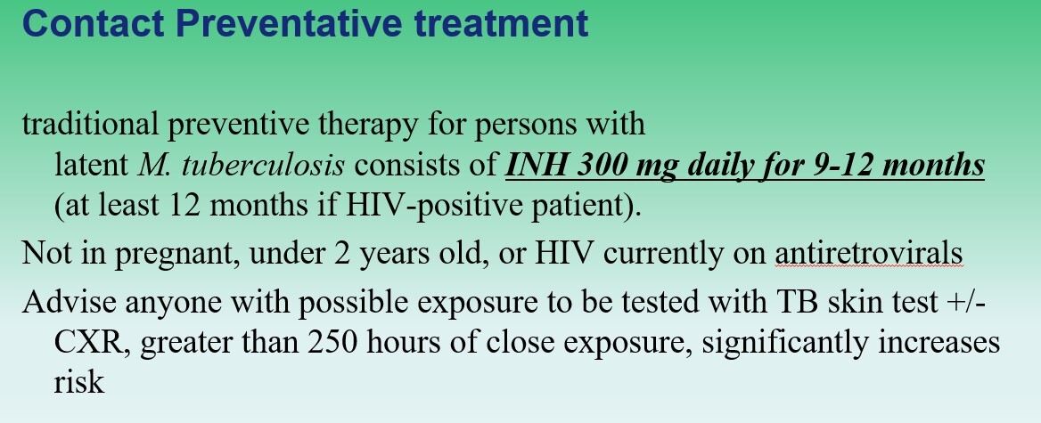 Trmnt for latent TB or asymp contact prevention