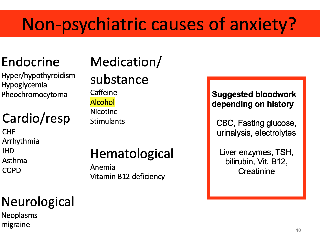 Quelles sont les investigations à demander pour R/O une condition médicale sous-jacente en présence d’un trouble anxieux de novo? (9)
