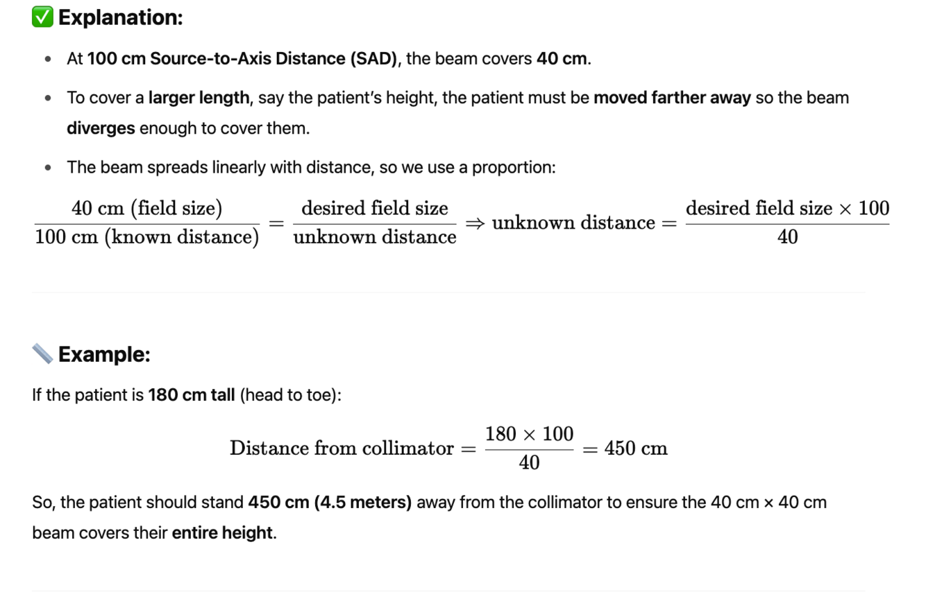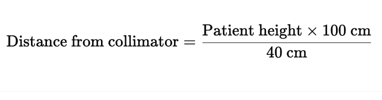 To determine the distance the patient should stand from the collimator so that a 40 cm × 40 cm field size (at 100 cm from the source) covers their entire body length, you use the inverse divergence formula based on similar triangles: