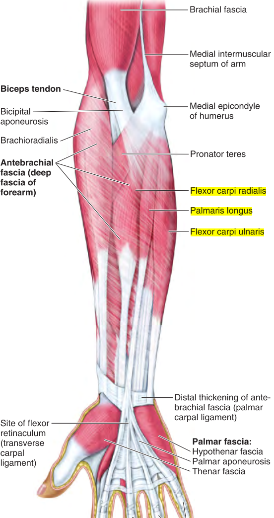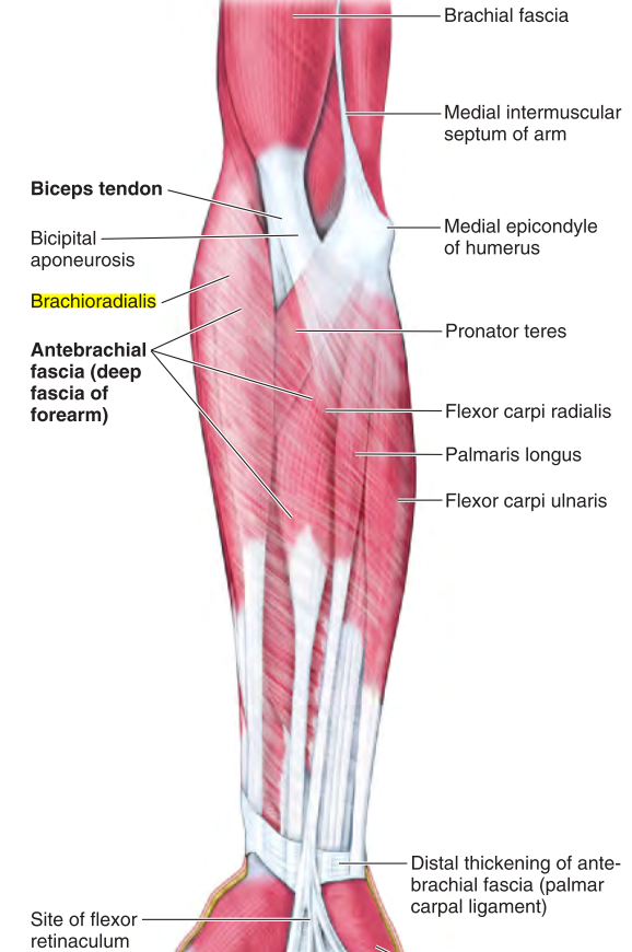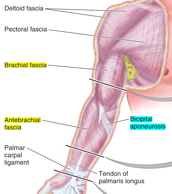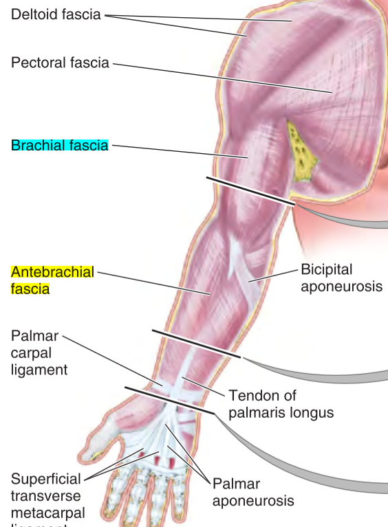 The brachial fascia continues distally down the arm and becomes the antebrachial fascia in the forearm, and ultimately becomes the palmar fascia in the palm.