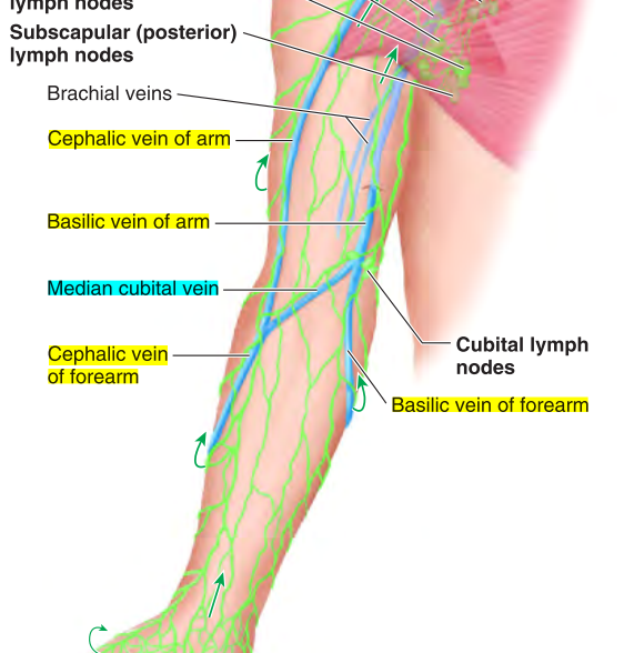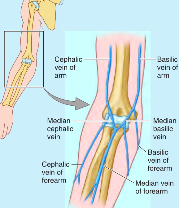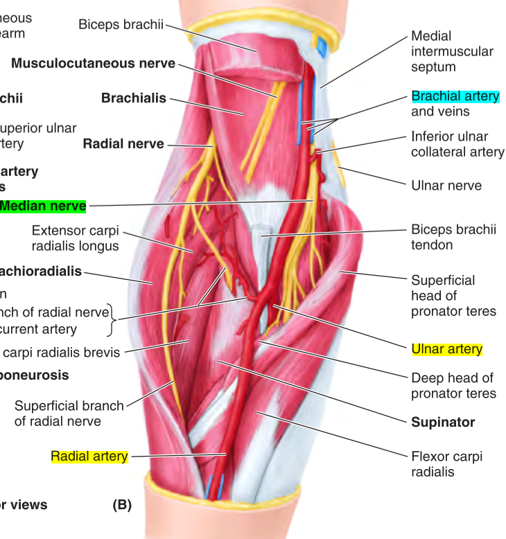 When the median cubital vein is used for venipuncture (ex: transfusion or intravenous injections), the brachial artery and median nerve are protected from being punctured by the bicipital aponeruosis which separates them from the overlying median cubital vein.