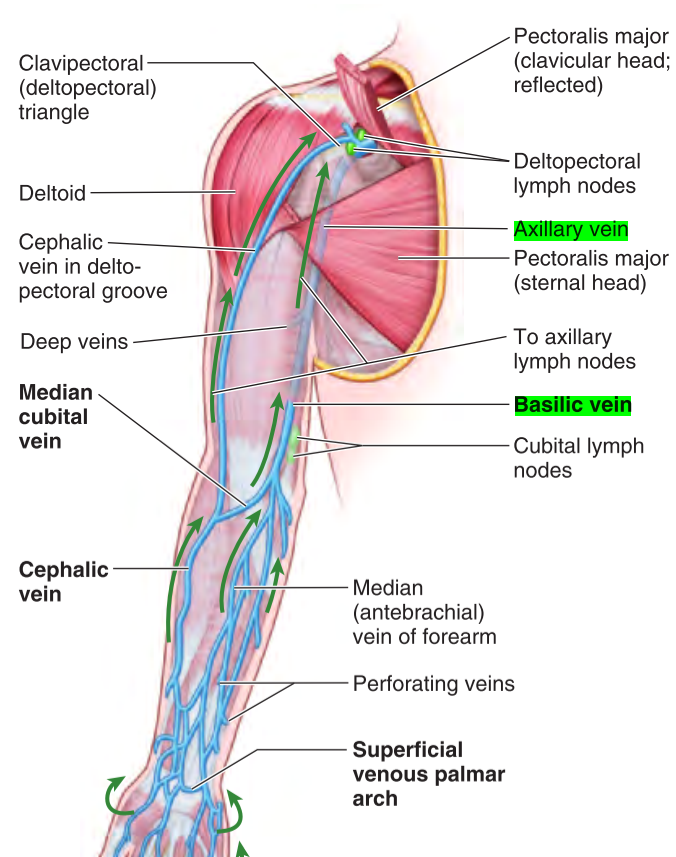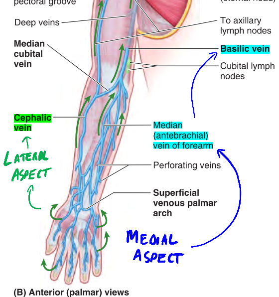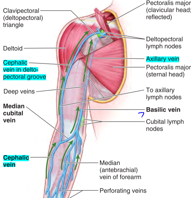 The cephallic and basilic vein interconnect via the median cubital vein in the cubital fossa.