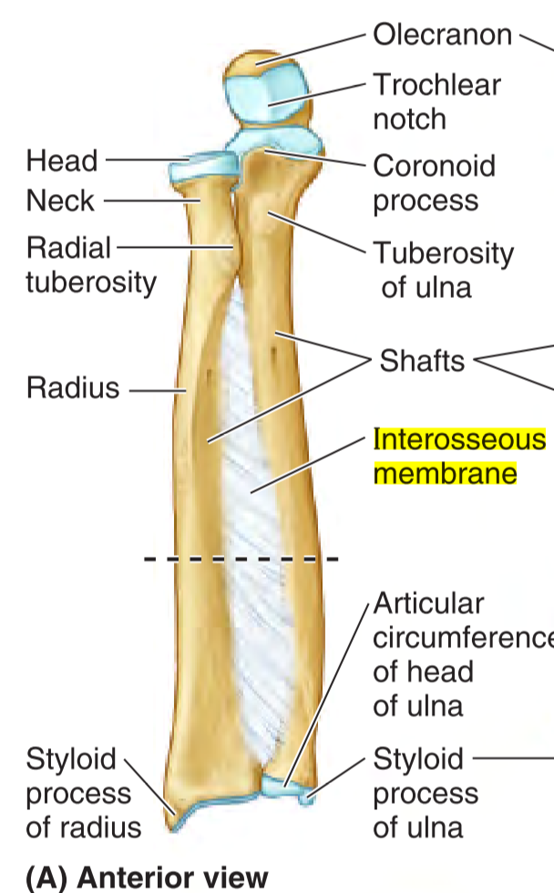 The fibrous interosseous membrane interconnects the radius and ulna and distributes any force recieved by the radius from the hand.