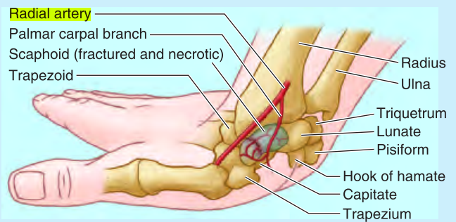 The radial artery is at risk when the scaphoid bone is fractured and if this artery is injured, then avascular necrosis of the proximal fragment of the scaphoid may occur (pathological death of bone resulting from inadequate blood supply).