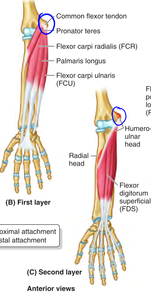 The medial epicondyle of the humerus is the main proximal attachment for the muscles of the anteromedial forearm.