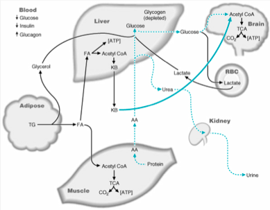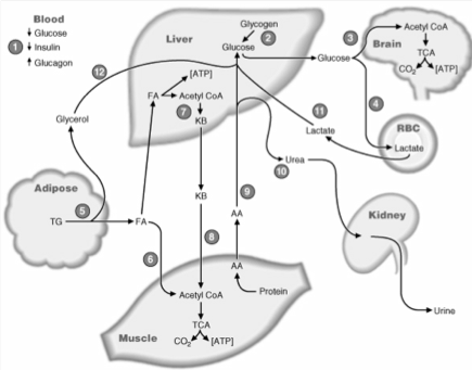 1) Blood glucose and insulin go down. Glucagon increases 2) Glucagon releases glucose into the blood from glycogen 3) Glucagon to adipose tissue and stimulates release of FAs and glycerol into the blood. 4) Muscle takes up FAs and oxidizes them for energy, breaks down amino acids. Glycerol, Ala and lactate go to liver for gluconeogenesis. Nitrogen is routed to urea cycle and is excreted in urine. 5) Fatty acid enters liver and makes acetyl-CoA, extra acetyl-CoA goes to ketone bodies. 6) Heart and muscle use ketone bodies. 7)