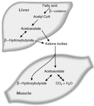 Beta oxidation produces acetyl CoA. Acetyl CoA -> acetoacetate which can further go to beta-hydroxybutyrate.