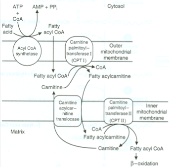 Fatty acid goes to mitochondrial membrane -> converted to fatty acyl CoA by fatty acyl CoA synthase + 2ATP -> converted to fatty acyl carnitine by CPTI -> shuttled into mitochondrial matrix -> goes back to fatty acyl CoA by CPTII -> beta oxidation