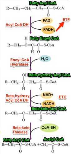 1) Acyl CoA DH + FAD converts fatty acyl CoA to fatty enoyl CoA and produces FADH2, which is carries to CoQ by ETF (electron transfer flavoprotein). 2) Water is added across the double bond in trans-delta2-fatty enoyl CoA by enoyl CoA hydratase to form L-beta-hydroxy acyl CoA 3) beta-hydroxy acyl CoA dehydrogenase + NAD oxidizes the hydroxyl group of L-beta-hydroxy acyl CoA to form beta-ketoacyl CoA and NADH 4) Beta-keto thiolase and another CoASH cleaves the beta-keto acyl CoA to form acetyl CoA and fatty acyl CoA. ***As the fatty acyl chain gets shorter the LCFA enzymes don’t work as well and the baton gets passed to MCFA enzymes, this is when MCADD causes trouble***