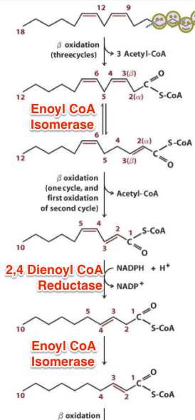 After several rounds of beta oxidation you end up with a cis double bond between 3 and 4 that prevents formation of the double bond between 2 and 3. Enoyl CoA isomerase can move the cis 3,4 to a trans 2,3 double bond and proceed with normal beta oxidation. Eventually you will end up with a trans 2,3 and cis 4,5 conjugated double bond. 2,4 dienoyl CoA reductase combines the conjugated double bonds to a trans 3,4 double bond. Then enoyl CoA isomerase moves it to 2,3 and beta oxidation can continue.
