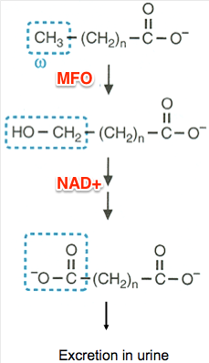 1) MFO (P450) hydroxylates the omega carbon 2) Further oxidation occurs in cytosol with NAD+ by dehydrogenases 3) Short dicarboxylic acid excreted in urine