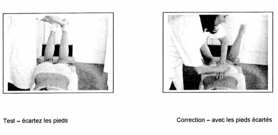 Pliez les genoux à 90° dans la position du test. Laissez les pieds tomber sur le coté latéralement et corrigez Pinéal.