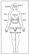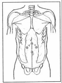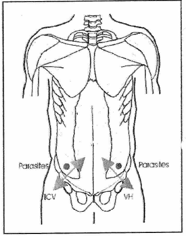 A mi-chemin sur une ligne à 45° vers le haut, entre le nombril et le bord inférieur des côtes sur la gauche pour le jéjunéum. Testez un m. intact.
