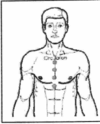 TEST: Placez le bout des 4 doigts, séparé de 2-3 cm en une ligne droite le long du sternum. Testez un m. intact