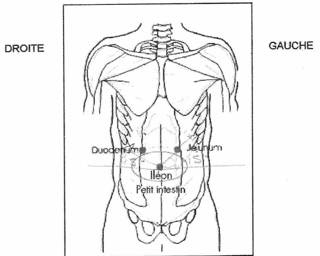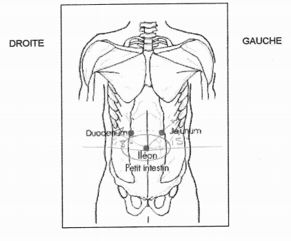 A mi-chemin sur une ligne à 45° vers le haut, entre le nombril et le bord inférieur des côtes sur la gauche pour le jéjunéum. Testez un m. intact.