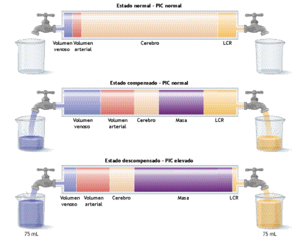 mantiene normal. Sin embargo, cuando este mecanismo compensatorio se agota, la PIC se incrementa exponencialmente aún con pequeños