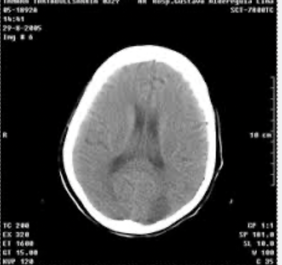 Se ve borramiento de circunvoluciones y cisternas, no se puede diferencia S.gris de blanca, ventrículos, etc