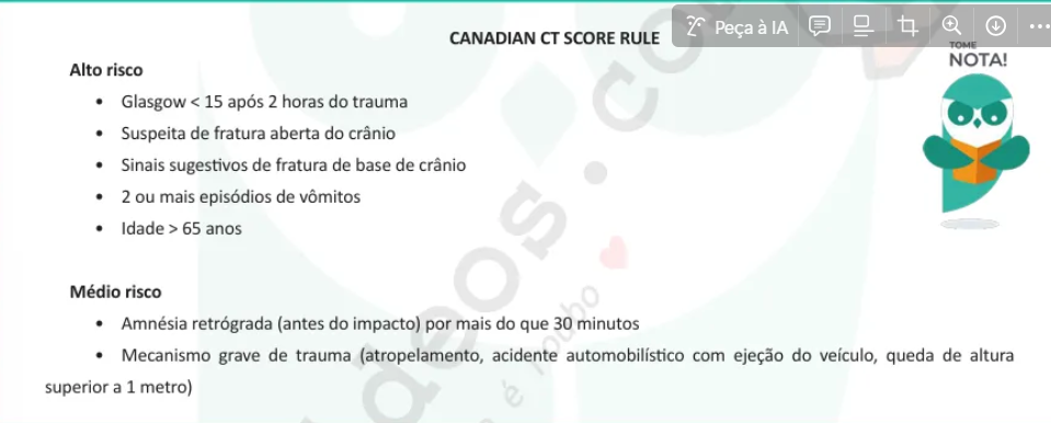 Ex: ECG <15 após 2h, vômitos, fratura, >65 anos, anticoagulantes, amnésia >30min, convulsão, déficit focal, etc.